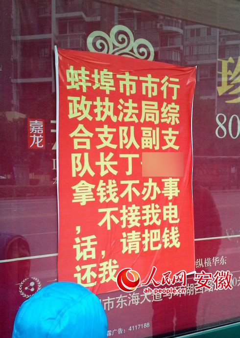 日前,一则特殊的海报现身蚌埠街头,这份海报不是用于宣传,而是举报蚌埠市行政执法局一名干部“收钱不办事”,此海报一出,引起社会关注。