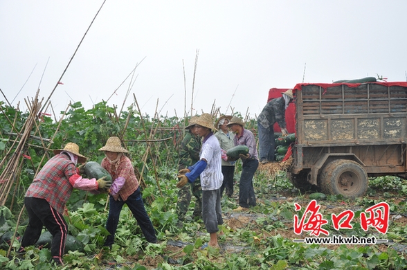 海口网4月16日消息(海口晚报记者谢大强 通讯员 陈创淼)15日上午,秀英区东山镇马坡洋万亩蔬菜产业园带动区一派丰收繁忙景象,村民忙着采摘个大浑圆的青皮冬瓜,“突突突”的拖拉机不停地往返转运,田间道路上到处是装载冬瓜准备出岛的外省大货车。