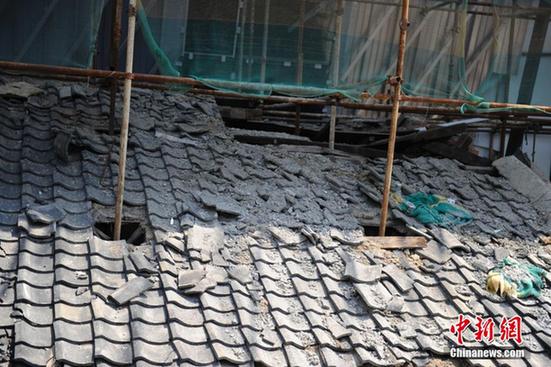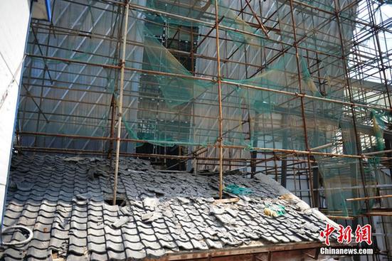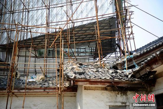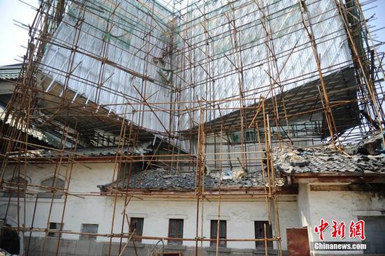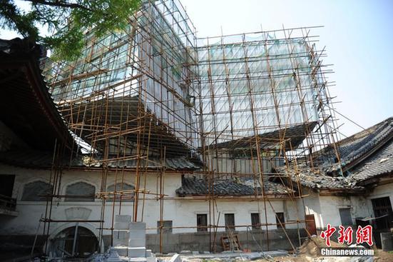5月7日,被违建“压顶”的长春东本愿寺旧址。近日,日本侵华时期建成的长春东本愿寺旧址遭到房地产开发公司违建破坏,引发了舆论的广泛关注。当日,长春市文物局工作人员回应称,政府相关部门正采取措施处理此事,已责令当事方拆除违建,确保恢复文物原貌。中新社发张瑶