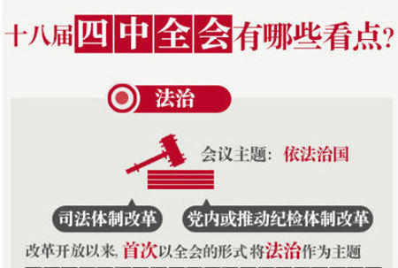 十八届四中全会三大看点:依法治国、司法体制改革、党内或推动纪检体制改革。