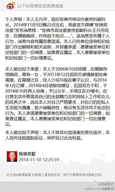 @新京报:【自称当事人发声明:极少接触异性】自称当事人王兴河的@风筝思絮称,此前消息纯属恶意造谣。其自称2006年结婚,婚内育有一女,2013年12月离婚后经人介绍认识现在妻子,2014年1月订婚,4月结婚,10月协商分手。“本人极少接触异性,绝没有生活作风不检点的行为”。声明详文如下: