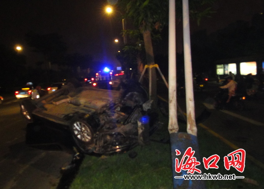 海口网11月17日消息(海口晚报全媒体记者 李云川摄影报道)陈先生夜间驾驶小车经过国兴大道,在超车中突然撞上绿化带,造成小车四底朝天。