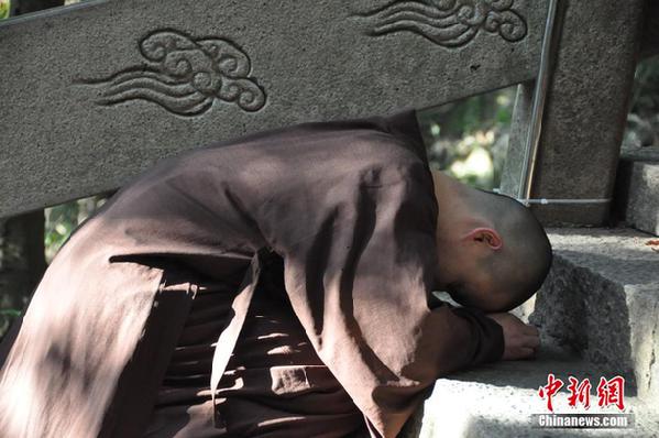 11月21日,中国四大佛山之一的浙江普陀山举行“佛顶顶佛”朝拜法会,普济禅寺方丈道慈大和尚率领僧尼和居士共800余人,从法雨禅寺出发,六步一拜行至佛顶山,历时两小时。