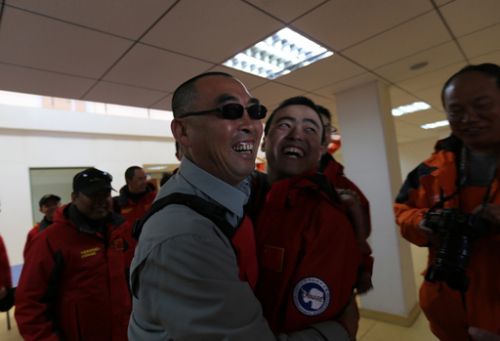 越冬队员与“老南极”崔鹏惠(左)热情拥抱