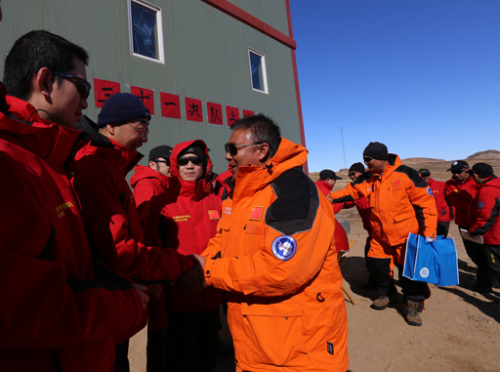 考察队领队袁绍宏(前右一)与越冬队员们一一握手