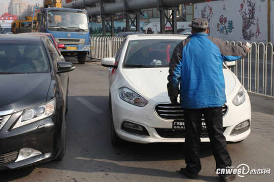 12月15日中午,西安西影路,一男子强行拦挡过往车辆索要钱财,造成交通堵塞。该男子拦车要钱已持续两年,无人管理。
