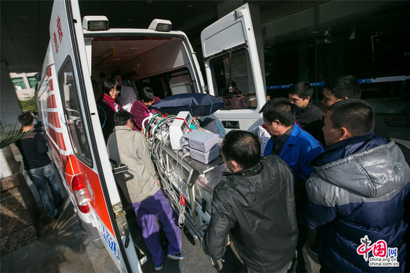 2014年12月29日,杭州,浙江大学儿童医院老院区,医护人员们把装有重症患儿的转运保温箱搬上救护车。陈中秋/CFP