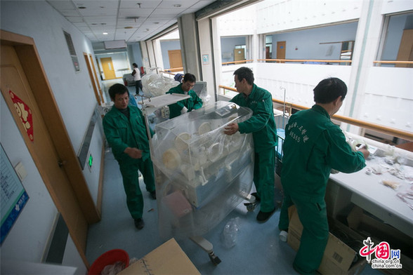 2014年12月29日,杭州,浙江大学儿童医院老院区,工人在搬运医疗器械。陈中秋/CFP