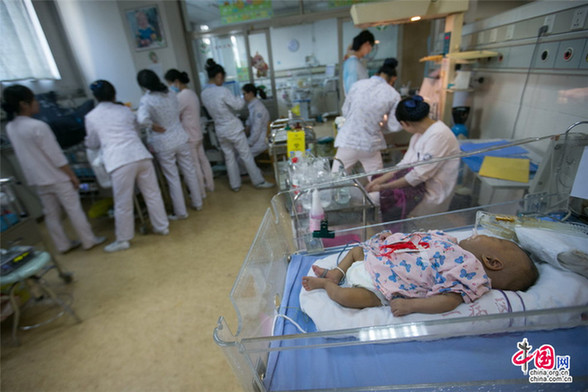 2014年12月29日,杭州,浙江大学儿童医院老院区,一个等待转运的重症患儿睡得正香。陈中秋/CFP