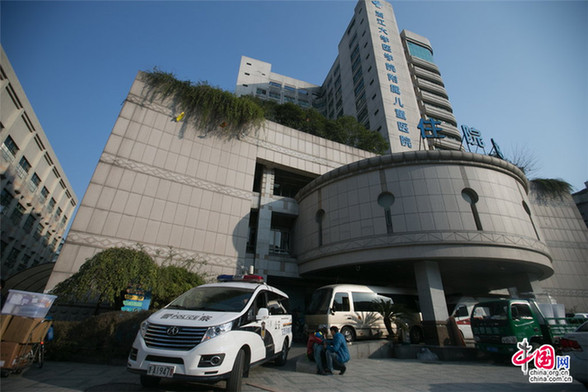2014年12月29日,杭州,转运部分重症患儿的中巴车,在警车开道护送下,离开浙江大学儿童医院老院区。