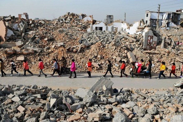 目前学校共有6个年级14个班,虽然该校所在地是郑州,但本地学生只有100多人,其余均来自全省其他市县。早上七点四十五分,百炉屯小学开始上课,如果在拆迁前,这个时间基本能满足学生花在路途上的时间。图为上学路上的学生,自从郑州百炉屯小学周边村庄拆迁后,学生们每天都要排队,穿越尽是建筑垃圾的废墟堆。