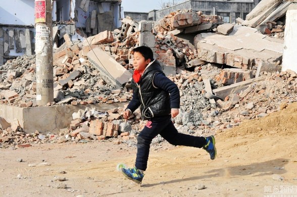 废墟上的百炉屯小学,是全国城市内都市村庄拆迁后都要面临的困境。一长期关注城市规划的学者称:“好多人认为,拆迁面临最大的问题是补偿,我认为,最大问题是,类似村庄内学生的教育问题。补偿可以慢慢谈,但未成年教育却不能等。”图为一个回家急切的学生,在废墟中奔跑。