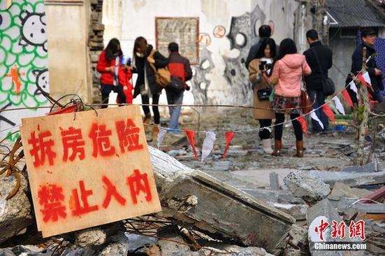 2015年1月24日,上海康定路600弄一处废墟上现涂鸦吸引不少市民前来拍照留念。