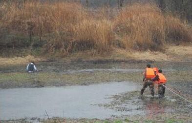 接到报警后,合肥消防支队高新中队迅速出动1部抢险救援车及7名消防官兵火速赶往现场救援。当时室外正下着雨,气温很低。赶到现场,只见一长发年轻女孩焦急地站在栏杆外,束手无策,远远看到一名年轻男子坐在湖中间的沼泽地里。经询问了解,该男子是因为与女友吵架不和跳进水中,被困在离岸边50米左右的水中半个多小时,双腿已经麻木动弹不得;加上下雨,天气异常寒冷,情况十分紧急,如果不及时救出,男子可能会有生命危险。