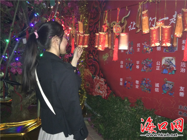 在现场,还有不少人在红绳上系上了自己对新年的新期望,在祝福墙上写下了自己的“爱情宣言”。“周婉君,我爱你!”、“希望今年能够找到心上人”、“祝全家人羊年心想事成”、“祝愿国家繁荣昌盛,海口更加美丽!”......希望这些祝福在今年都能够成功实现。