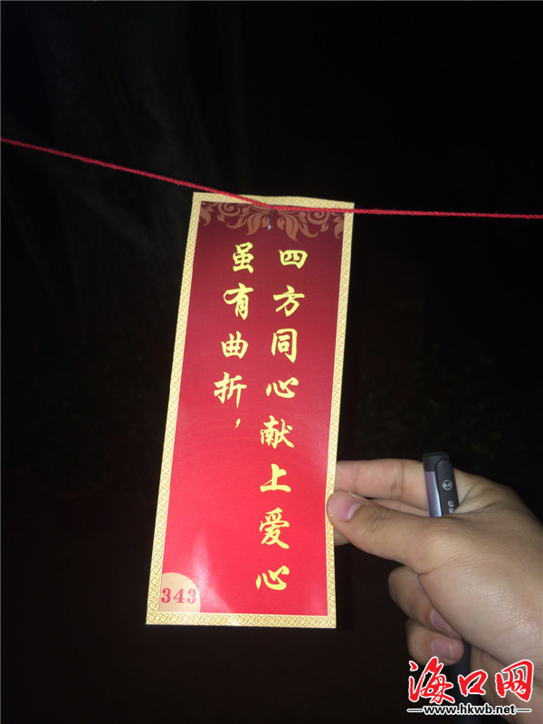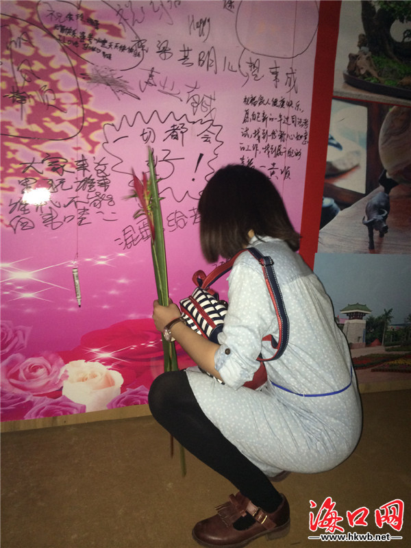 市民梁先生晚上七点钟不到,就带上妻子和女儿来海南花卉大世界逛换花节。他们一家三口排队领取了志愿者发放的祝福卡后,来到工作人员精心布置的祈福区,认真地写下自己的心愿。“希望父母身体健康、妻子开心,儿女更加聪明伶俐!”梁先生写到。