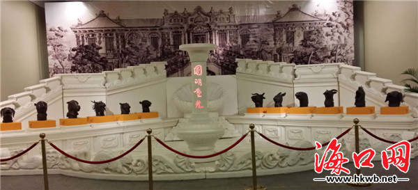 在展厅里,记者看到了中国人家喻户晓的十二生肖兽首(仿制 品)栩栩如生,圆明园兽首在1860年被英法联军掠夺后流落四方, 近年曾因在国外拍卖而引起国人广泛关注,已经成为圆明园海外流 失文物的象征。十二生肖兽首(仿制品)是在海口首次展出。