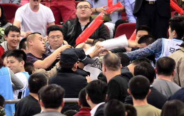 比赛最后还剩2分钟,几位辽宁球迷和北京球迷在看台上发生了挥拳互殴,几位辽宁球迷按住一个穿着北京队球衣的球迷挥拳怒打,另外两个身穿北京队球衣的球迷想要上去帮忙,但由于挥拳太过猛烈,根本插不上手。随后赛场的特警及时赶到制止了球迷的互殴。