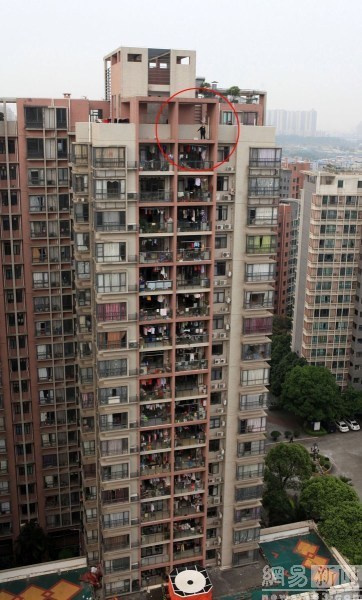 家住格林小区18楼的周女士称,自己家的厨房阳台正对女子要跳楼的位置,看得很清楚。她称,晚间曾听到有女子哭闹了很久,“最早是在夜里12点多,我起来给孙子倒水喂奶,就听到有女人吵闹和哭声。”她猜测,应该就是该女子。图为该女子站在19楼楼顶欲跳楼。