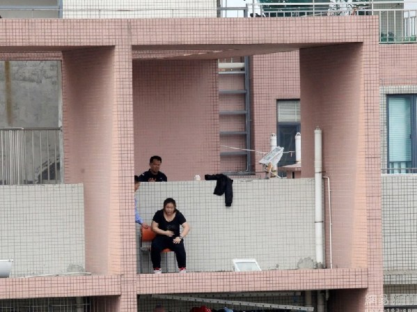 2015年3月17日,广东东莞,一女子爬上南城区西平社区金色华庭北门左侧19楼楼顶,欲跳楼轻生。在与救援人员对峙近4个小时之后,9点44分左右,该女子最终被劝离,成功解救。该女子声称其家人没有陪伴其过生日,欲跳楼轻生。图为该女子坐在楼顶欲跳楼。