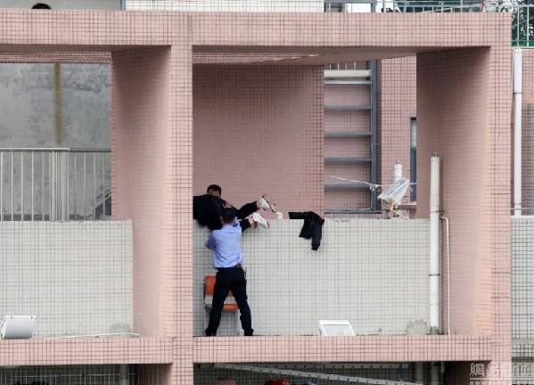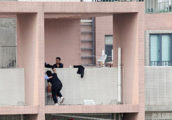 经过民警长达4个小时的耐心劝解和安慰,女事主于近10时在民警的陪同下离开楼顶,回到自己位于2楼的家中。图为警察成功将女子拉起翻过墙头。