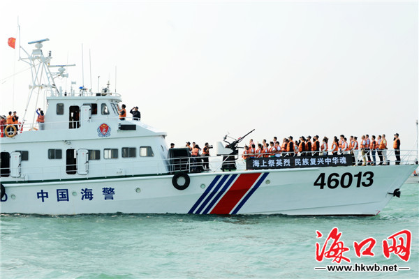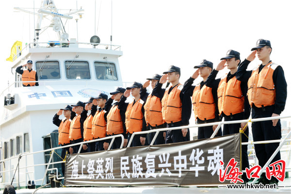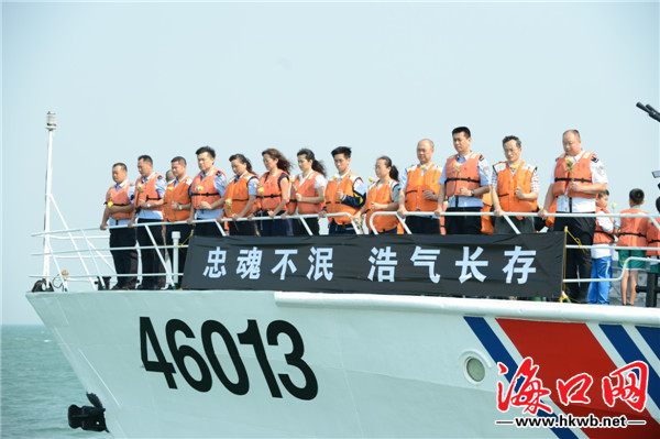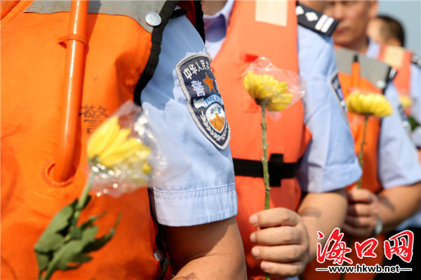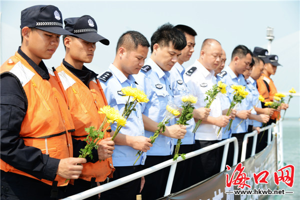 当天上午9时许,参加活动的英烈家属、公安民警、海警官兵和群众代表列队分别登上两艘海警舰艇,从码头出发,到琼州海峡海口海域举行祭奠仪式。辽阔的海面上,舰艇两侧悬挂着“海上祭英烈 民族复兴中华魂”、“忠魂不泯 浩气长存”的横幅,黑底白字在碧海蓝天下庄重肃穆。随着国歌声响起,全体民警、海警官兵和少先队员代表向舰顶缓缓升起的国旗敬礼。礼毕,在舰艇指挥员的带领下,举起右拳,“继承英烈遗志,不怕牺牲,无私奉献……”的誓词在海面上回响。鸣笛、默哀——低头注视着手中的菊花,民警们深深陷入对牺牲战友的哀思。默哀礼毕,大家纷纷将片片花瓣洒向大海,向已逝的公安英烈传递思念和缅怀之情。