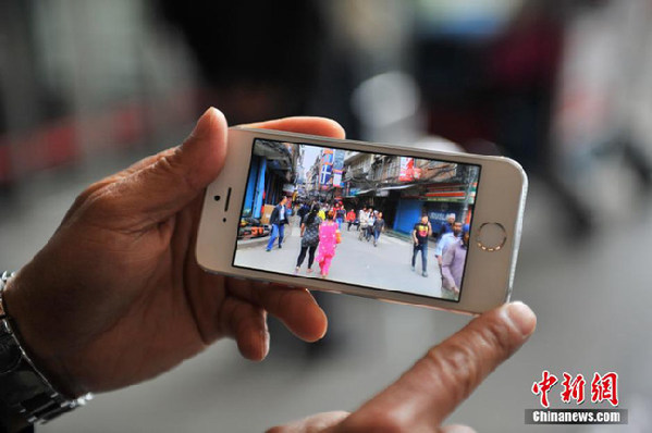 4月26日,旅客向记者展示地震发生时的情景。中新社发 刘冉阳 摄