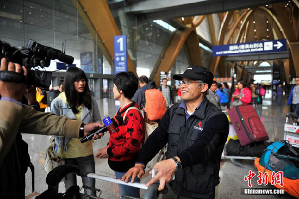 4月26日,安全抵达的旅客向记者挥手致意。当日,受尼泊尔地震影响,滞留加德满都的230名中国旅客乘机安全抵达昆明。