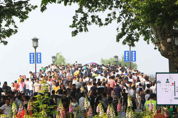 2015年5月1日,杭州,五一小长假第一天,一大早,西湖景区游客爆满,断桥上黑压压一片,只见人头不见桥头。