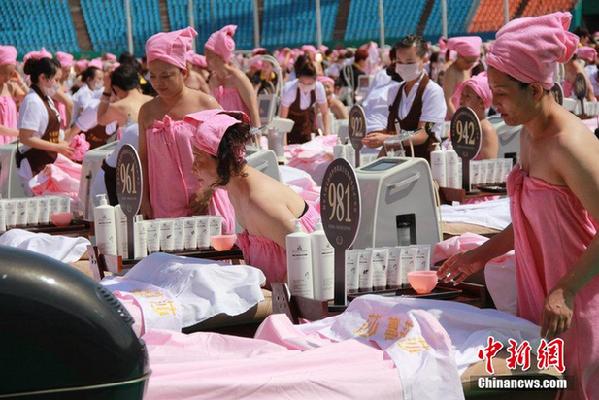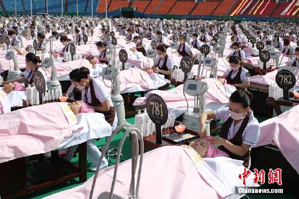 2015年5月4日,山东省济南市,千人美容挑战吉尼斯的活动在山东省体育中心体育场举行,足球场上摆放了1000张美容床、1000个美容仪器,1000名美容师为1000位爱美女士现场免费做面部护理,女士全部现场更衣穿上粉色浴袍,成功创造新的吉尼斯世界纪录。
