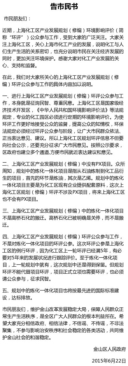据上海市金山区政府网站“上海·金山”消息,金山区政府发布《告市民书》,对规划环评工作进行说明。说明称,这次上海化工区规划(修编)环评不涉及PX项目,将来上海化工区也不会有PX项目。