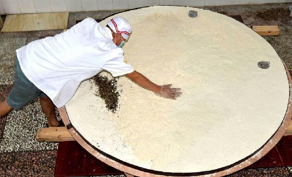 09月26日,广西河池,由宜州市怀远镇史记老牌传统月饼坊8名民间工匠历时10个小时、直径2米的民族传统美食手绘“白月饼”终于制作完成。据该店店主史超文说:“巨型手绘白月饼耗费米粉、花生、白糖、芝麻、核桃等原料约200公斤,是为今年怀远镇中秋万人祭月活动专门制作的。”