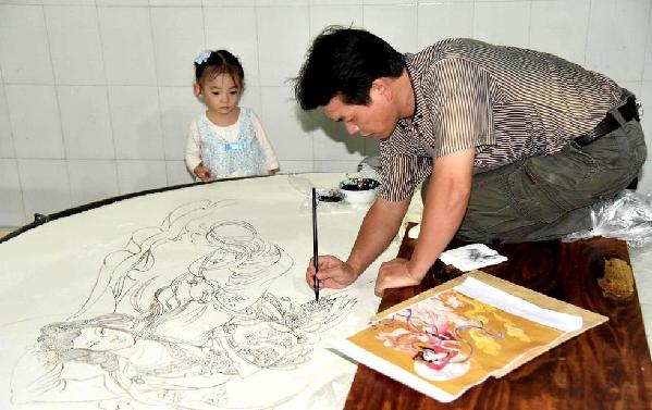 26日中午,记者就守候在月饼坊,全程记录直径2米巨型手工制作(绘制)的白月饼诞生过程。宜州市怀远镇的史记老牌传统糕点店传承祖传技艺,采用上好的糯米炒熟打成细粉,再用白糖油搅拌,加上炒香碾碎的花生、芝麻、核桃等,经过蒸、压等一系列繁杂工艺后,由画师用祖传的可食材料在饼上手工绘出寓意团圆和美、吉祥如意的图案,月饼取名《嫦娥奔月》。