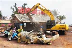 据介绍,该餐厅申报的临时建筑早已到期,政府执法程序已走完,为实现和谐拆违,属地长流镇及城管部门多次上门做经营者的思想工作。当天拆除面积达3000多平方米,为避免二次污染,城管部门边拆边清理产生的建筑垃圾,拆除完后将尽快复绿,恢复海岸带的美观。紧靠海珊瑚主题餐厅旁边的一家海边幼儿园,因涉及老师与幼儿的分流与安置,经上级同意,暂缓拆。