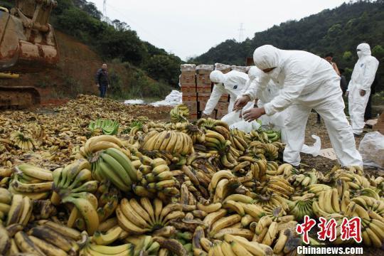 2个40尺集装箱所装的3172箱,重34.78吨,货值3.3万美元的不合格进口菲律宾香蕉,25日被碾平、压碎,并在深圳出入境检验检疫工作人员的监督下被填埋销毁。