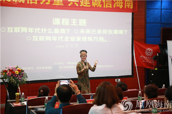 汇聚诚信力量,共建诚信海南。4月1日下午,由海南省诚信企业协会主办的“互联网+诚信”公益讲座在海口开讲。讲座特邀“智慧之光”女性导师周百萍老师主讲,现场吸引100多名来自各行各业的企业家欢聚一堂,共修心灵之旅,感悟诚信力量。