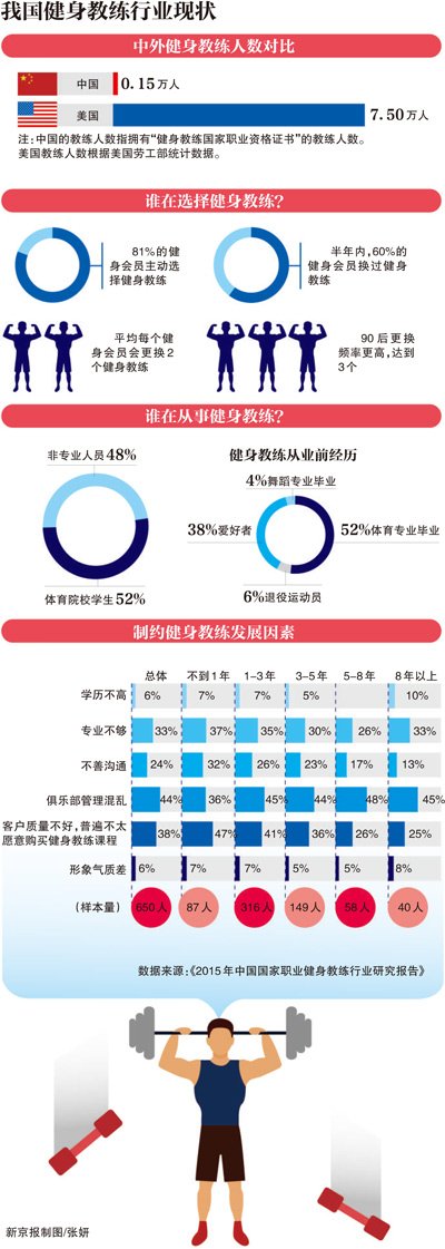 2015年11月,国家体育总局职业技能鉴定指导中心发布的《2015中国健身教练职业发展报告》称,在私教行业,入职1-3年的“新人”中,52%的人有专业背景,其余的48%没有专业背景。