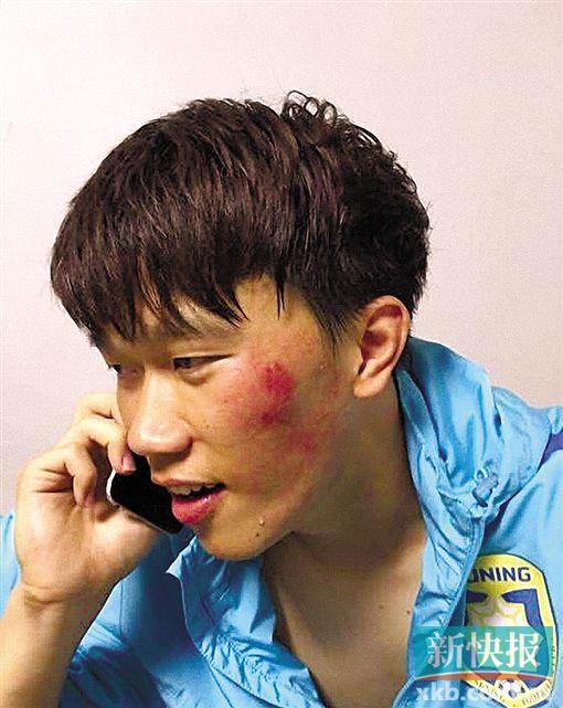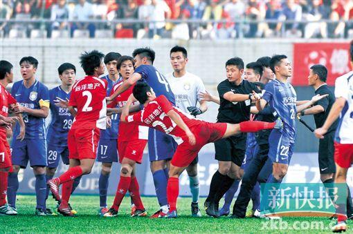 ■比赛之后,江苏队球员吴曦(右)遭到对手飞踹。CFP/图