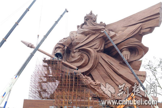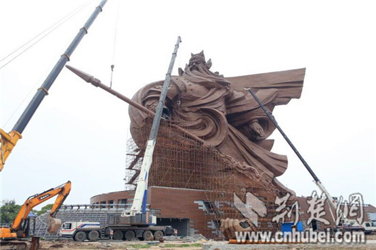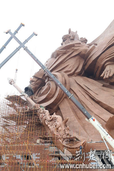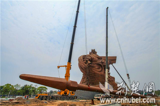 前几天,荆州关公圣像大刀的吊装工程正式启动。经过一段时间的紧张施工作业,刀身部位的安装已经基本完成。荆楚网记者从工程指挥部获悉,5月18日开始,圣像大刀的刀柄部位吊装、焊接工程也已经启动了。
