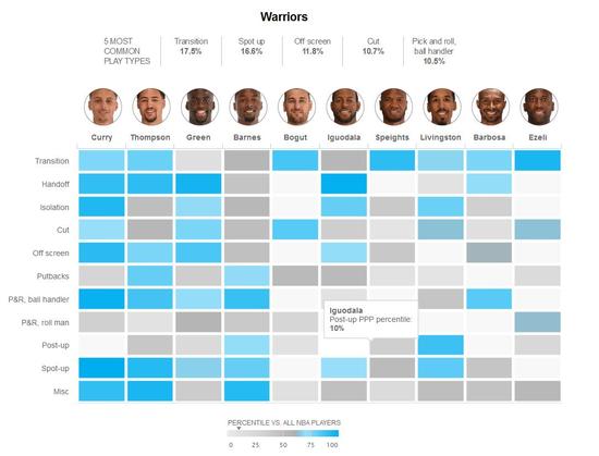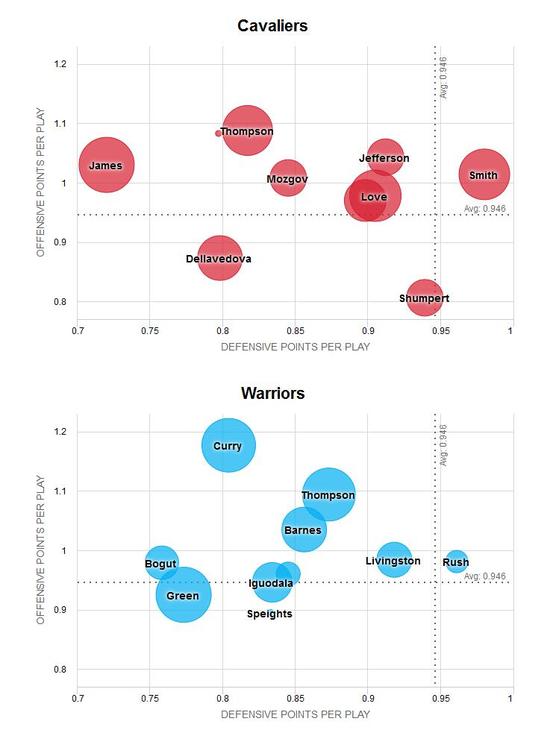 每个人每回合进攻的平均得分以及他防守下对手每回合的平均得分,这个数据能够很好地考量出谁在攻防两端是那个更可靠的球员。防守端,对于骑士来说,勒布朗-詹姆斯是他们至今为止最好的防守球员,他每回合防守失分只有0.72,这同样也是常规赛联盟的最佳纪录;而勇士这边,安德鲁-博格特是他们最可靠的防守球员,0.758的每回合防守失分同样很高效。[人工智能小炮竟已提前预测首战赛果!]