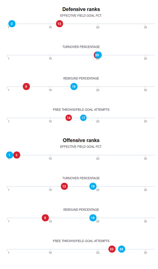 迪恩-奥利弗,这位篮球技术分析的鼻祖确定了以下这四项分别作为攻防质量的重要指标。通过下图可以看到,骑士这边由于有TT和勒夫的存在,他们的篮板保护是强项,而由于进攻端詹姆斯和欧文大量持球的原因,他们的失误率一直不低;而对于勇士来说,他们既擅长投射同时也擅长防投射,而其他攻防数据都没有排进联盟前十。这也从一定程度上说明了,篮球就是一项你投进然后再让对手投不进的运动。