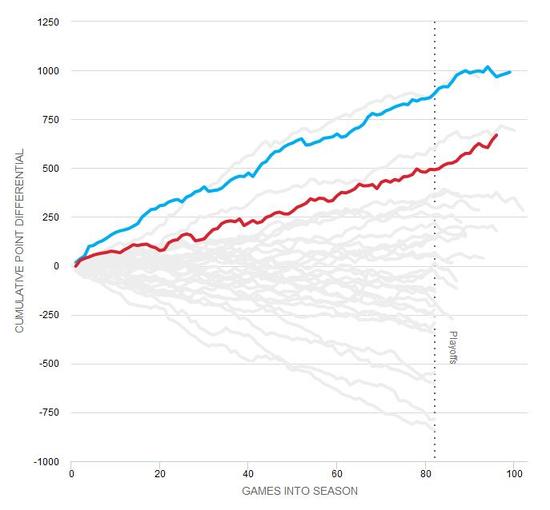 净胜分是一项非常能反应球队真实战力水准的数据,在这方面,骑士虽然是东部净胜分最高的球队,但是他们依旧没办法跟勇士较量。在场均净胜分这项数据上,唯一能跟勇士接近的只有马刺,两队常规赛结束后的总净胜分实际上只相差了10分。下图是两队本赛季累计净胜分的走势。