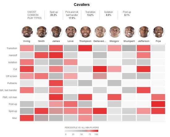在下图中,我们将得分方式分为了11种,并且每种都与联盟平均水准做了对比(颜色越深代表超出均值越高),可以看出,詹姆斯在其中的4项都超过联盟80%的球员,而库里则多达6项。