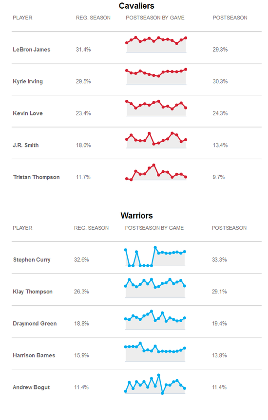 在之前的季后赛中,詹姆斯和欧文都是非常可靠的核心,他们都能有稳定的发挥。但是凯文-勒夫却稍微差了一点儿。勒夫在今年季后赛的前八场都能拿到两双,场均18.9分12.5个篮板,但是在接下来的5场里,他场均只有14.2分4.4篮板了。这些场均贡献的波动直接也导致了他回合占有率的波动。相比于骑士,勇士这边,在库里受伤不在的比赛中,汤普森发挥了非常重要的作用,而随着西部决赛的进行,格林的占有率在不断上升。