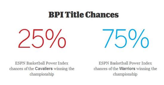 根据著名的BPI系统预计,总决赛中,勇士有75%的概率夺冠,而骑士的夺冠概率则有25%。双方的首场交锋将在北京时间3号上午9:00打响。