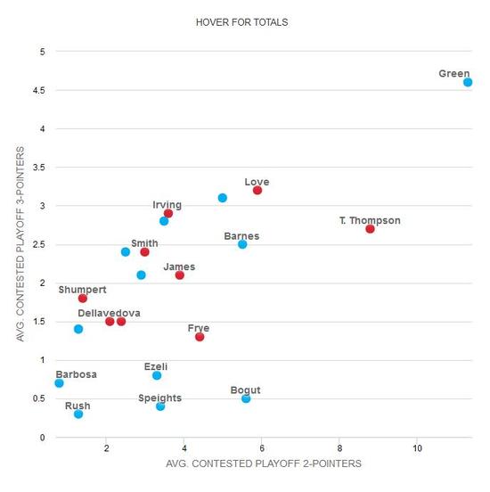 在今年的季后赛防守中,勇士专注于想办法让对手的投手面前永远有人,志在让对手的每次出手时都有自己的球员干扰。他们今年季后赛中,场均对手有66.2次的投篮出手是有干扰的。在所有季后赛球队当中排在第三,而骑士的对手场均的受到干扰的投篮只有57.1次,是季后赛球队中第二低的。