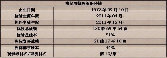 在执掌首尔FC的四年半时间里,崔龙洙不仅率队拿到过K联赛冠军、杯赛冠军,并且还在2013年率首尔FC拿到了亚冠亚军。至于在执教战绩方面,崔龙洙率首尔FC累计打了253场比赛,取得了130胜69平54负,胜率达到了51%,输球率却只有21%,毫不夸张的讲,崔龙洙的执教胜率虽不及里皮(执教恒大期间胜率66%)这样的一代大师,但却要高出大多数中超教练。另外在亚冠赛场上,崔龙洙此前率首尔FC拿到了21胜17平10负,胜率达到了44%,可见,崔龙洙也绝对不是那种外战外行型教头。