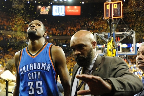 季后赛,雷霆4-0横扫小牛成功复仇;半决赛4-1力克湖人,再次完美雪耻;西部决赛面对稳如泰山的马刺队,杜兰特将青春活力发挥到极限,他以场均28.5分、7.4篮板、3.7助攻、1.5抢断和1.2封盖的数据让马刺无可奈何,最终雷霆以4-2淘汰马刺,成功进入总决赛。
