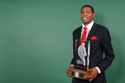 菜鸟赛季,杜兰特场均贡献20.3分,4.4篮板,2.4助攻,1抢断。由于状元秀奥登饱受伤病困扰,因此杜兰特毫无悬念的摘得了当赛季最佳新秀头衔,这也是他职业生涯中的第一个奖项。