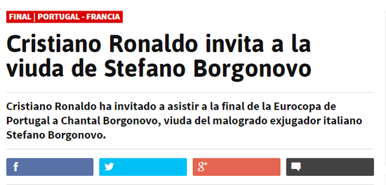 在与法国决赛之前,C罗邀请了前佛罗伦萨球员博格诺沃的遗孀前往法兰西大球场观赛。博格诺沃曾经效力米兰和佛罗伦萨等俱乐部。在他的职业生涯结束之后,不幸患上“渐冻症”,身体基本瘫痪,最后只有眼睛可以活动。
